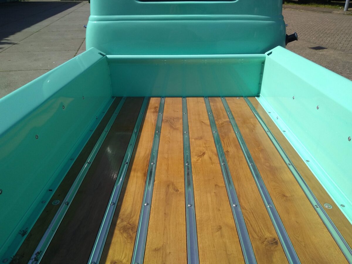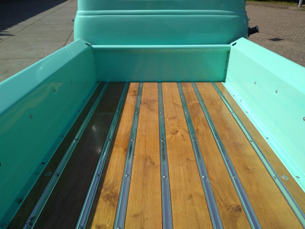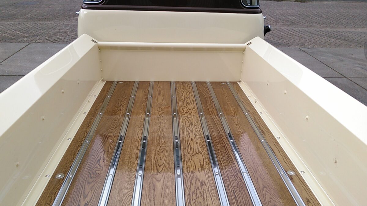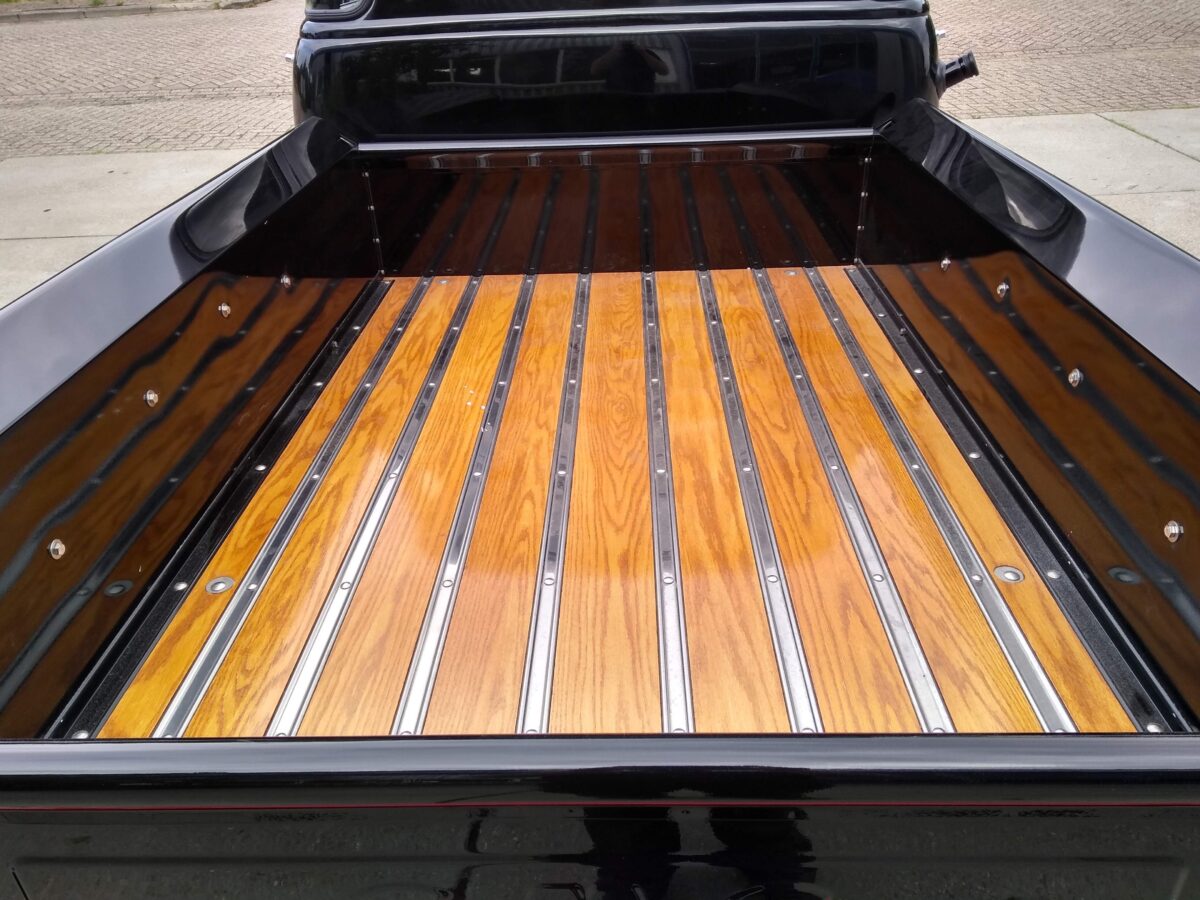 Nieuwe “made in the USA”laadbak wordt ongemonteerd in kleur en lak gespoten. Na montage word de laadbak op het chassis geplaatst en voorzien van een houten vloer.Hier is de keuze uit eiken of grenen.De vloer is vooraf voorzien van een laklaag en eventueel gebeitst. Achterlichten worden gemonteerd en bedrading naar de achterzijde wordt afgemaakt.