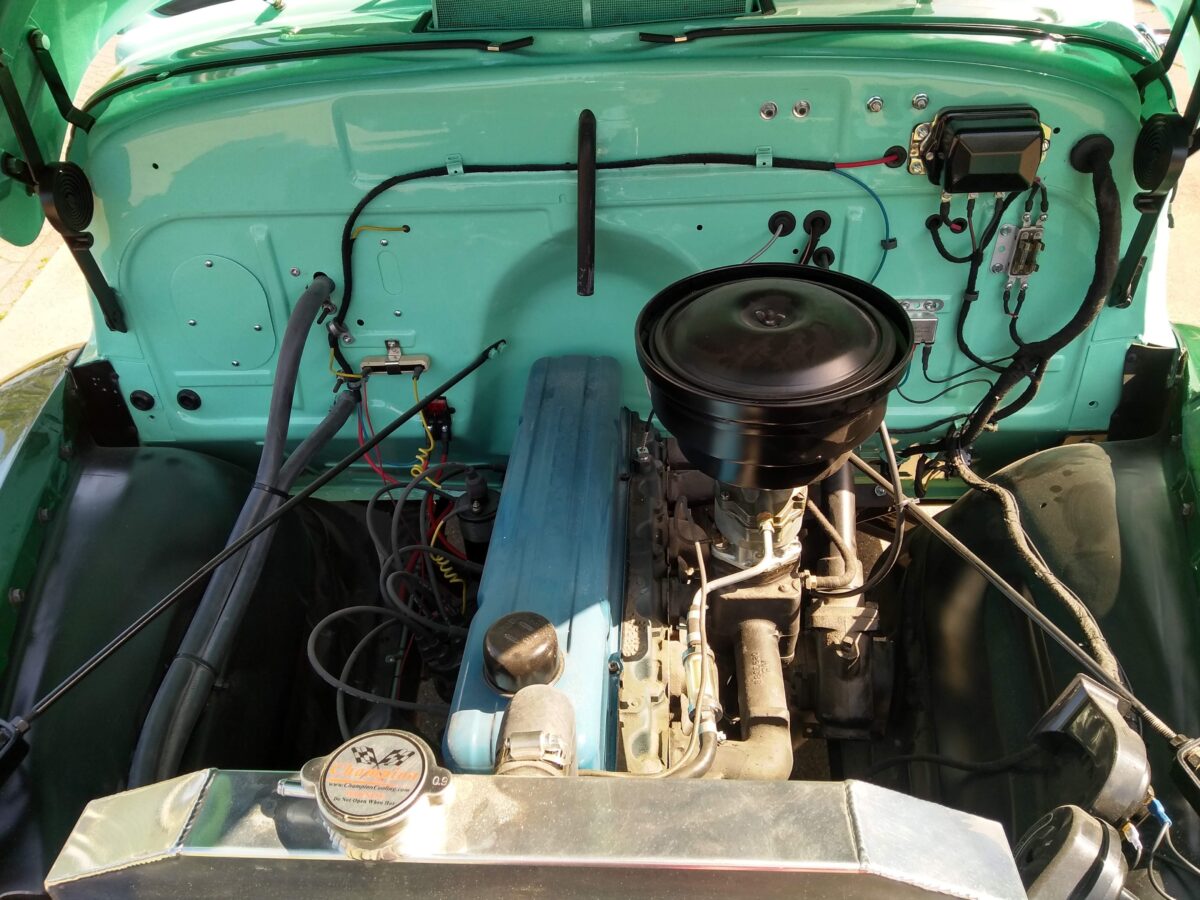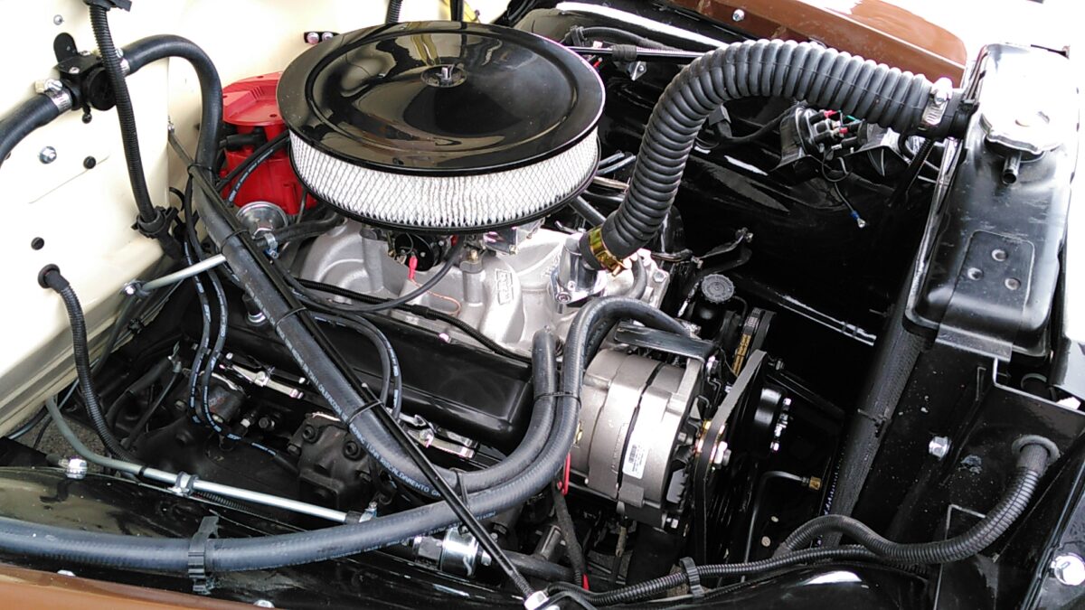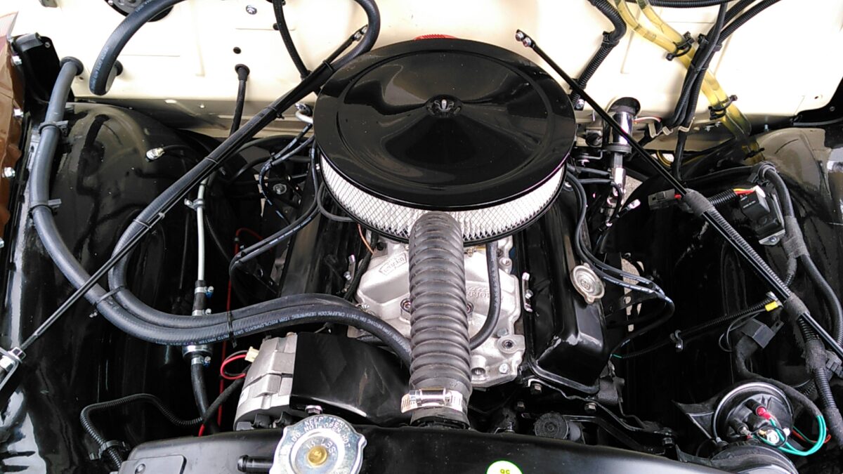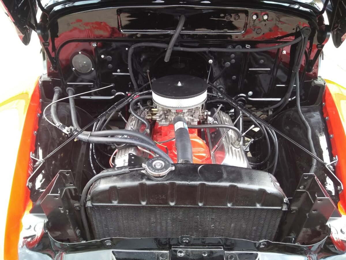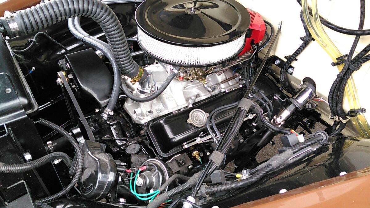 Nieuwe 5.7 liter Chevrolet motor en compleet gereviseerde TH350 Automatische Chevy 350ci V8transmissie worden nu geinstaleerd.Bedrading naar de motor word nu afgemaakt.Nieuwe waterpomp,dynamo,onsteking etc. word gemonteerd Nieuw uilaatsysteem wordt gemonteerd. Hier is de keuze een enkel of dubbel systeem.