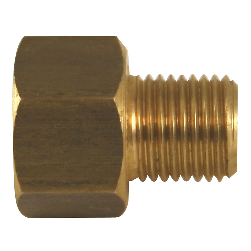 Bridge mismatched thread sizes in seconds. This precision-machined brass inverted-flare adapter converts a 1/2-20 female seat to a 7/16-24 male seat, forming a tight, vibration-resistant seal for dependable brake, fuel, and hydraulic-line connections.